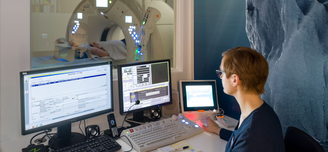 Sie sind von Ihrem Arzt zur Durchführung einer Computertomographie (CT) überwiesen worden. Das ist ein bildgebendes Verfahren, mit dem ein detaillierter Blick in Ihren Körper möglich ist. Die Untersuchung dauert wenige Minuten und ist schmerzfrei. Hier können Sie ergänzende Informationen und den für diese Behandlung nötigen Fragebogen herunterladen.